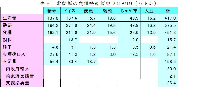 生産量は417万トンで、食糧需要は451.3万トンとあるが、調査時点での約束済国際支援はわずか2.1万トンで、北朝鮮政府が20万トンを輸入した場合の食糧不足は136.4万トンとなる。 食糧生産量と約束済支援量の合計は419.1万トンで、北朝鮮が自ら輸入せず、国際支援もない場合は、2019年の人口は2,570万人なので、年間一人当たり食糧は約163kgになる。食糧需要の451.3万トンが満たされれば、年間一人当たり約175kgになる。
